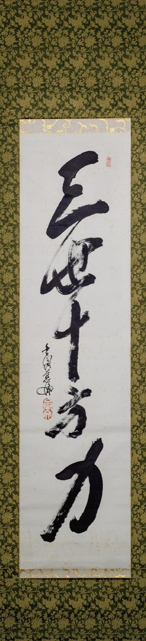 同传世的茶碗一样,每一件茶挂后面都有一个人,或書写者或拥有者,以及如影随形的故事,这些故事往往十分耐人寻味,并给心灵带来感动。“就拿这件《三世十方力》来说吧。”他指着墙上一件笔法朴拙又不失雄浑的茶挂说。“你第一眼见到它,会觉得它就是一句佛语,并没有太多的感触。但是,如果你了解它的创作背景,就会有所感叹。”这件作品出自一位京都金阁寺僧人之手。众所周知,金阁寺是日本著名的临济宗寺院,因寺内核心建筑“舍利殿”外墙饰以金箔而得名。1950年时,有位僧人觉得寺院如此奢华和张扬,与日本传统美学中“诧寂”“幽玄”格格不入,便在殿内自焚,将金阁寺烧毁了。随后,金阁寺僧人村上慈海就同其他僧人一道云游全日本,募集重建资金。为了表示决心与意志,他写下了这件作品,发心以三生三世的十方之力来重建金阁寺。当它出现在茶室中,就表明主人要以坚定的意志力去实现自己的愿想。